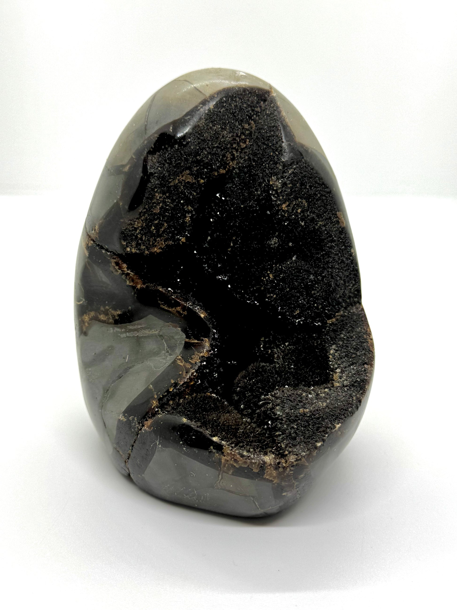 La Septaria sauvage, également nommée "pierre du dragon" ou "oeuf de dragon", est chargée d'une énergie exceptionnelle. Ce nom lui a été donné en raison de sa cristallisation uniquement interne, qui est invisible depuis l'extérieur.